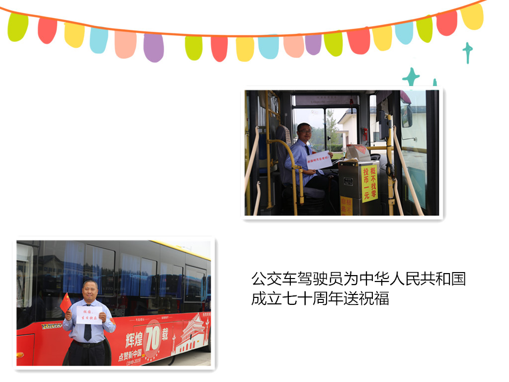 公交公司還在301路“西楚清風(fēng)號”及201路“紅旗車隊(duì)”公交車內(nèi)懸掛國旗,組織各崗位員工為中華人民共和國成立70周年送上祝福,表達(dá)對黨、對國家的熱愛。