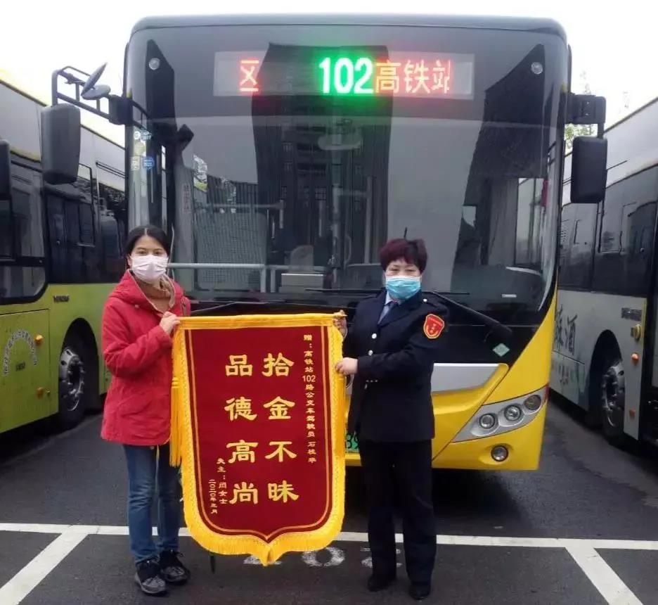 3月25日,市民閆女士帶著錦旗來到公交高鐵站點,感謝駕駛員石桂華拾金不昧。