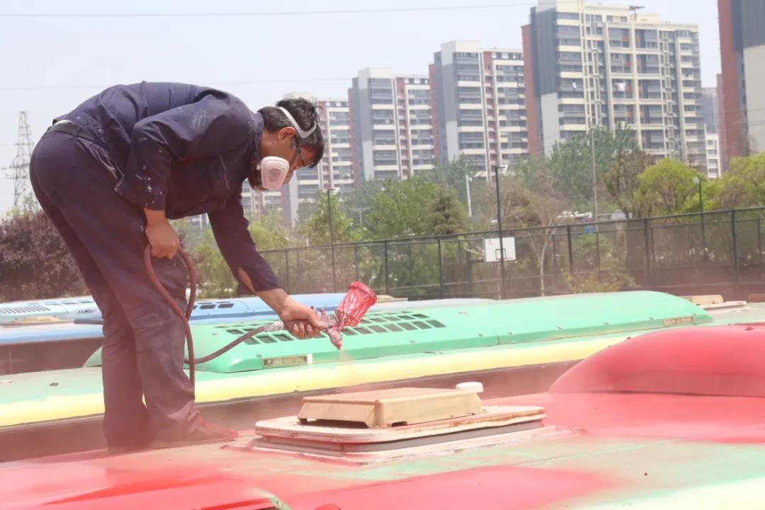 5月30日是星期日,上午10時(shí),太陽(yáng)炙烤著大地。在公交公司修理廠(chǎng)院內(nèi)的空地上,七八輛公交車(chē)露天停放。在公交車(chē)頂部,油漆工戴著防毒面具,穿著“五彩斑斕”的工作服,在熟練地進(jìn)行噴漆作業(yè)。