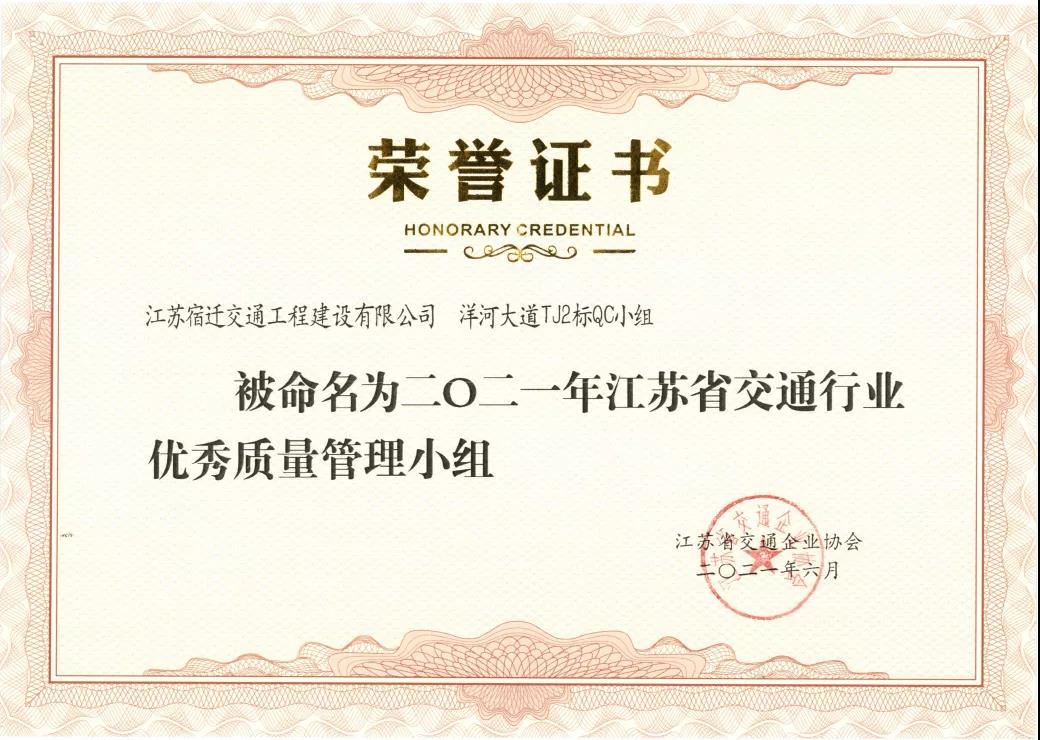 近日,宿遷交建268省道宿遷段工程項目QC小組、洋河大道TJ2標(biāo)QC小組、宿遷市高鐵商務(wù)區(qū)路網(wǎng)工程QC小組被江蘇省交通企業(yè)協(xié)會授予“2021年度江蘇省交通行業(yè)優(yōu)秀質(zhì)量管理小組”稱號。
