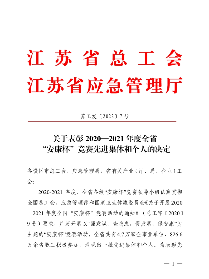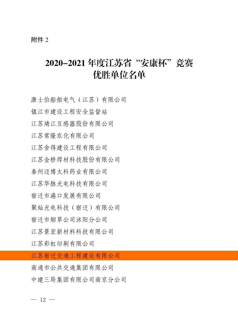 日前,省總工會和省應(yīng)急管理廳發(fā)文通報了2020-2021年度江蘇省“安康杯”競賽評選情況,宿遷交建榮獲省“安康杯”競賽“優(yōu)勝單位”的榮譽稱號。