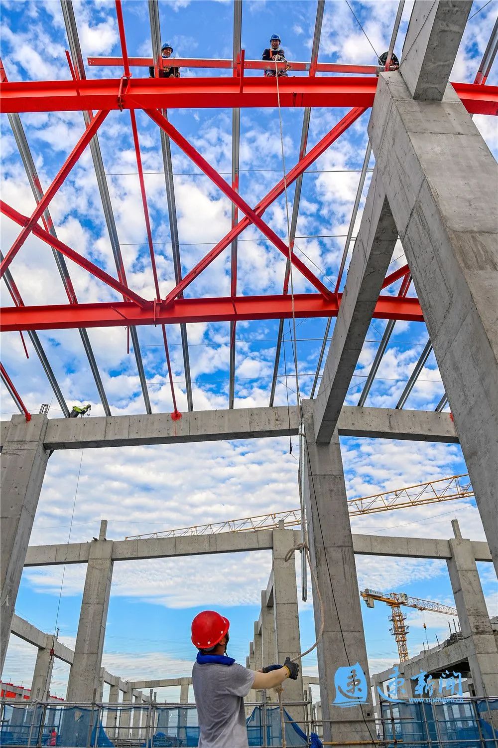 8月12日清晨,在江蘇通湖物流園二期工程施工現(xiàn)場,建設(shè)工人正在有序施工。