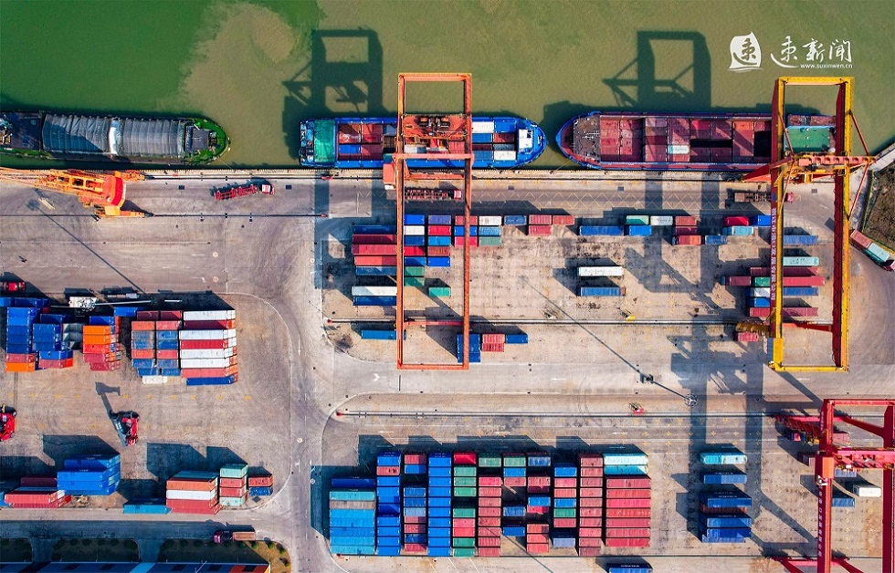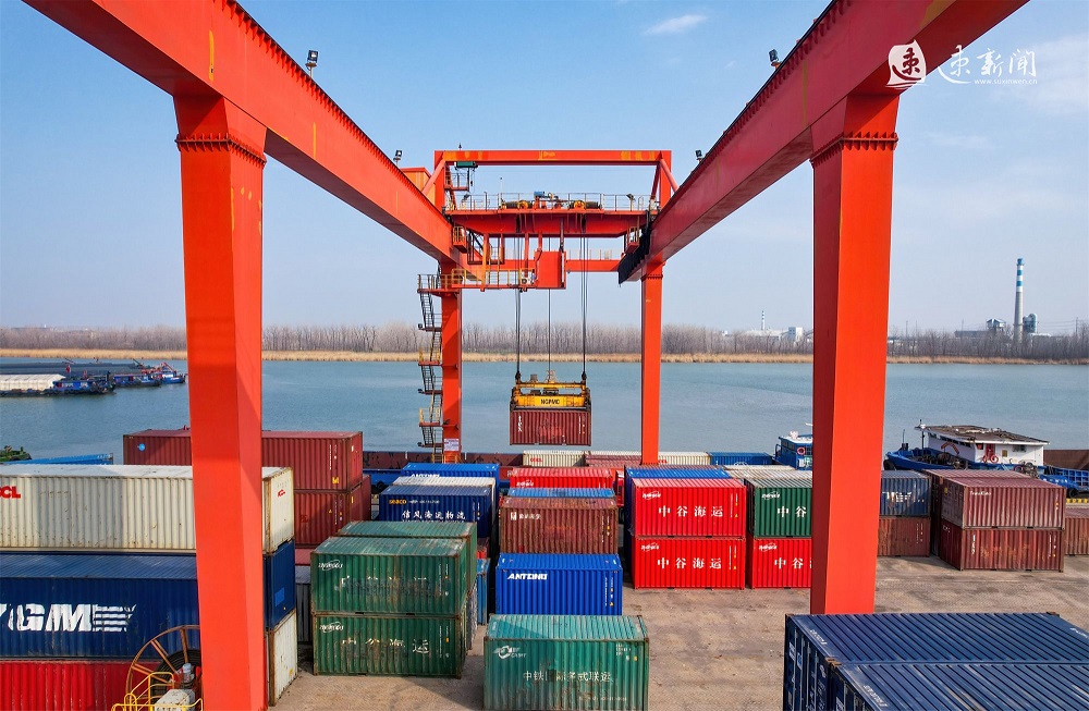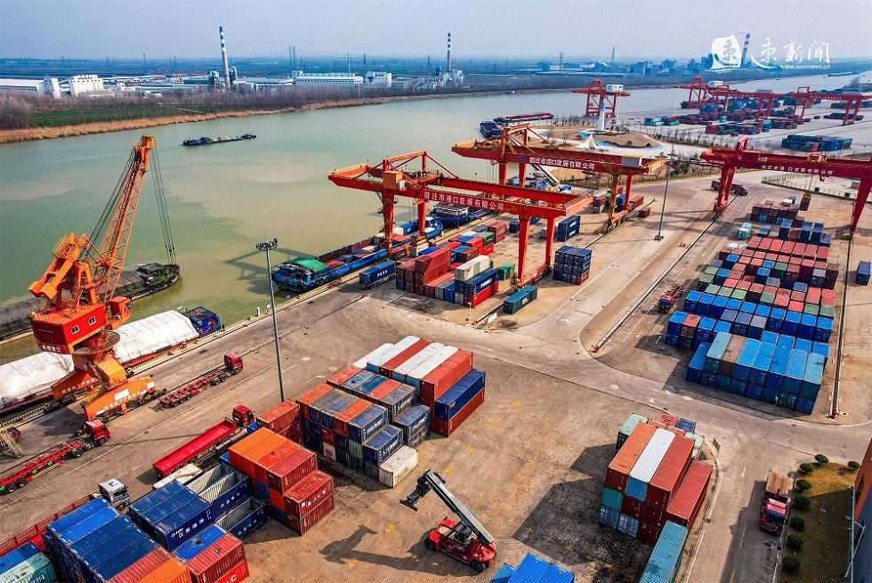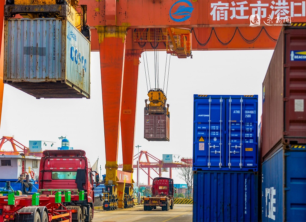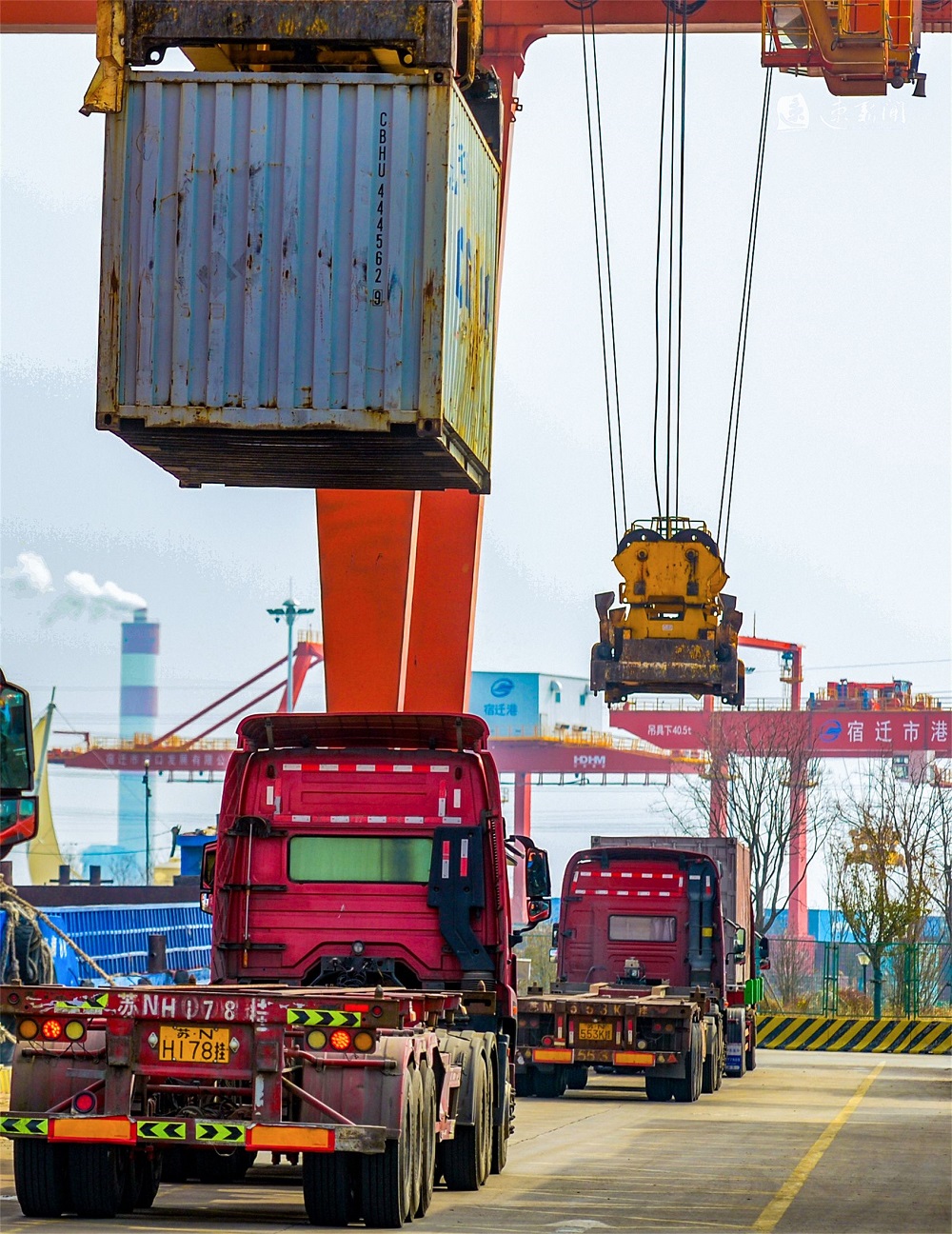 2月18日,在運(yùn)河宿遷港集裝箱碼頭,工人們正在有序作業(yè),運(yùn)輸車輛來(lái)回穿梭,起重機(jī)正在緊張地裝卸貨物,力爭(zhēng)龍年“開(kāi)門紅”。