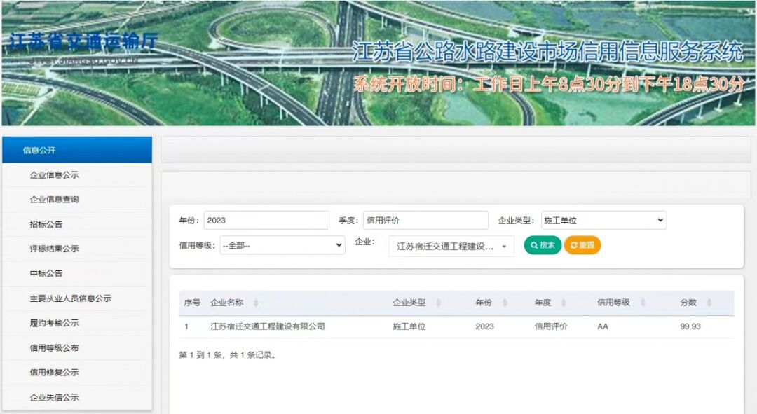 近日,江蘇省交通運(yùn)輸廳公布《2023年度公路水運(yùn)建設(shè)市場(chǎng)從業(yè)單位信用評(píng)定結(jié)果》,宿遷交建成功獲評(píng)AA級(jí),這也是連續(xù)四年獲此殊榮。