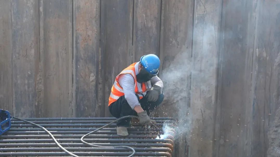 在宿遷大道項目現(xiàn)場,電焊工穿著長袖工作服、戴著勞保手套,只見他一手拿著焊槍,一手拿著防護面罩,正進行承臺鋼筋焊接,電焊產生的火花飛揚濺射。