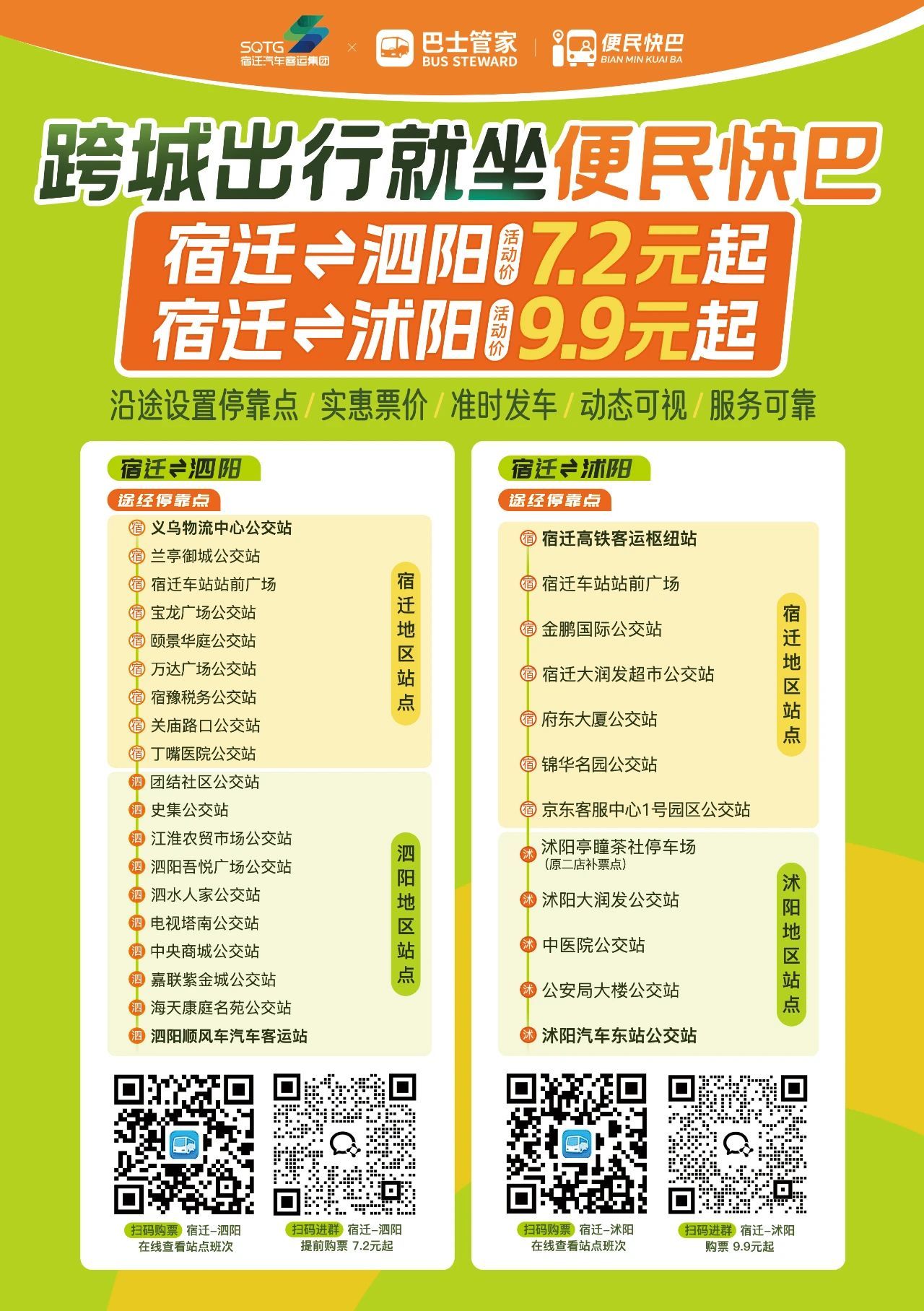 【宿汽集團(tuán)】沭陽(yáng)9.9元、泗陽(yáng)7.2元!宿遷“便民快巴”雙線已開(kāi)通,運(yùn)營(yíng)時(shí)間、站點(diǎn)最全清單來(lái)了