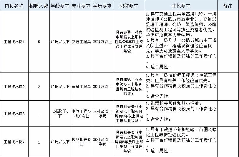 具有一級建造師或高級工程師,且市政或交通工程管理經(jīng)驗豐富的特殊人才,聘用形式及薪酬待遇可一事一議。