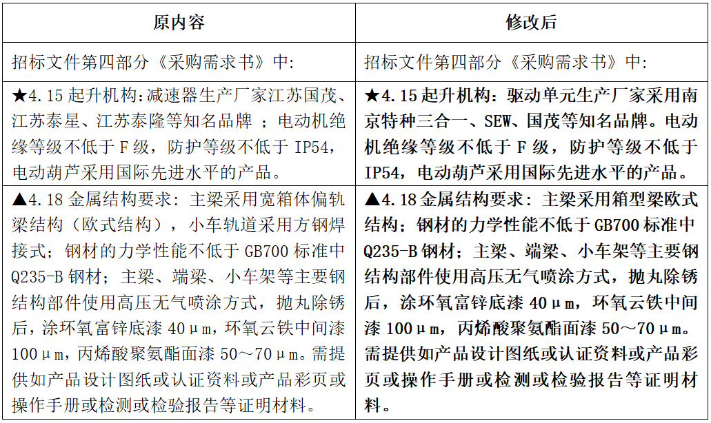 通泰建材歐式單梁橋式起重機設備采購項目澄清公告